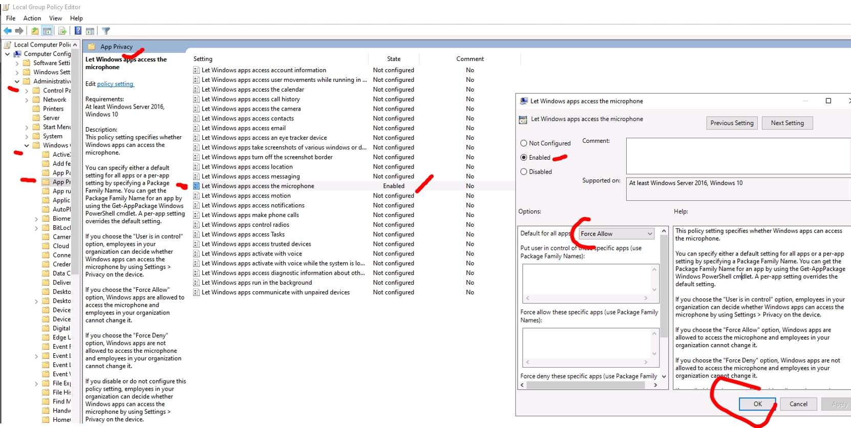 2) Выбрать Lets Windows Apps access the microphone и применить Enable – Force Allow.
