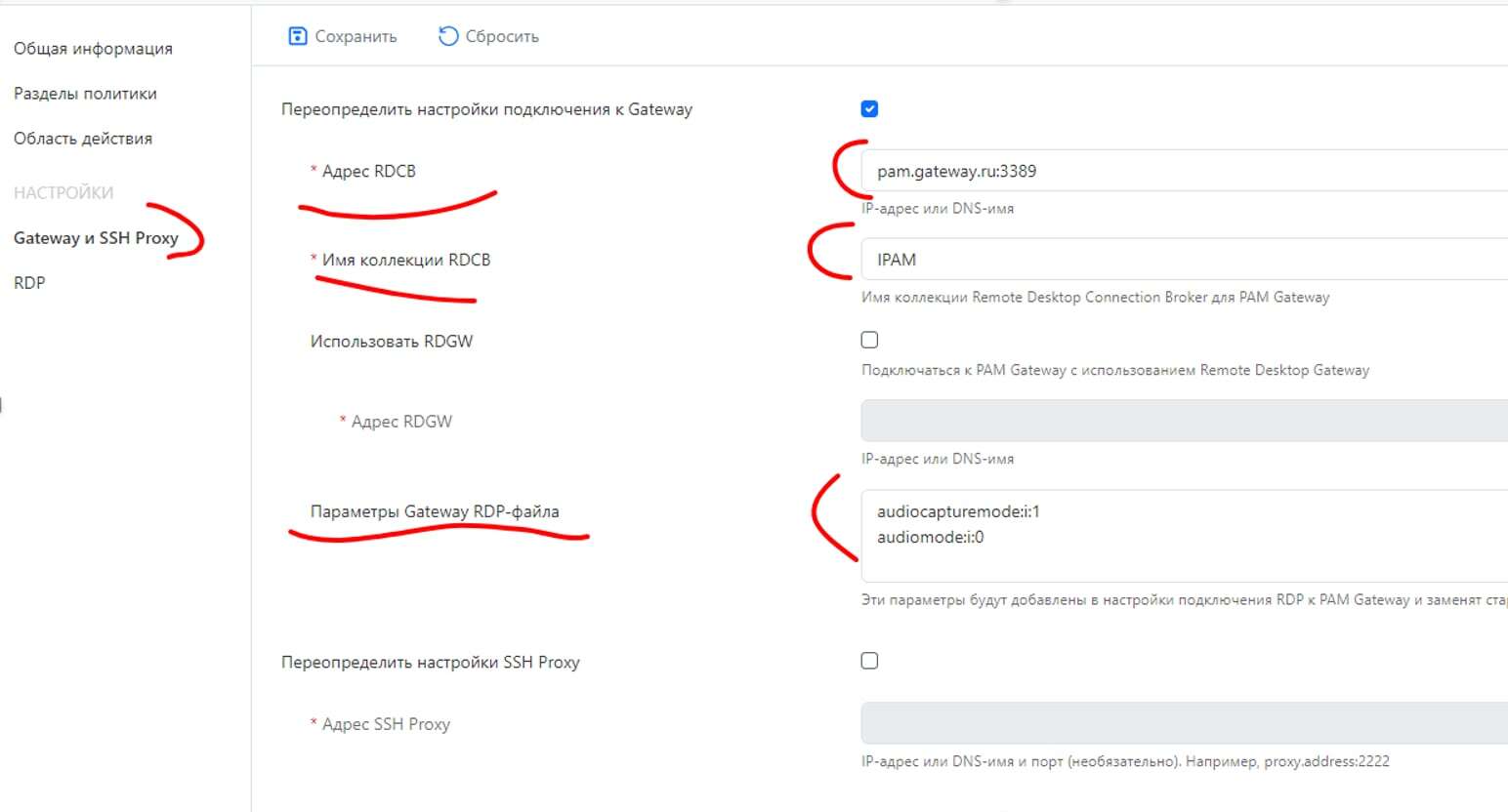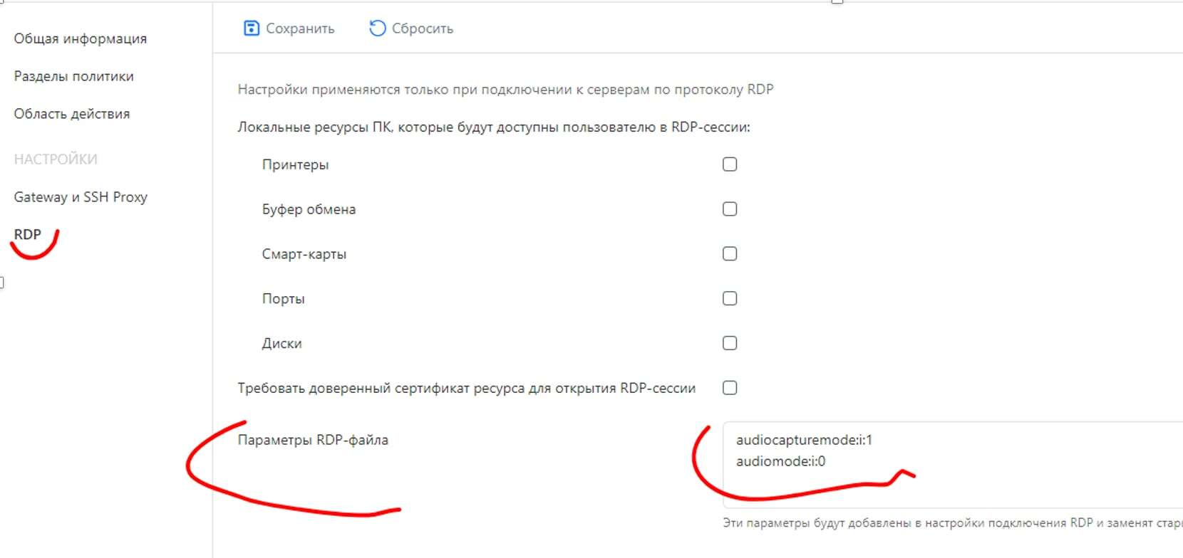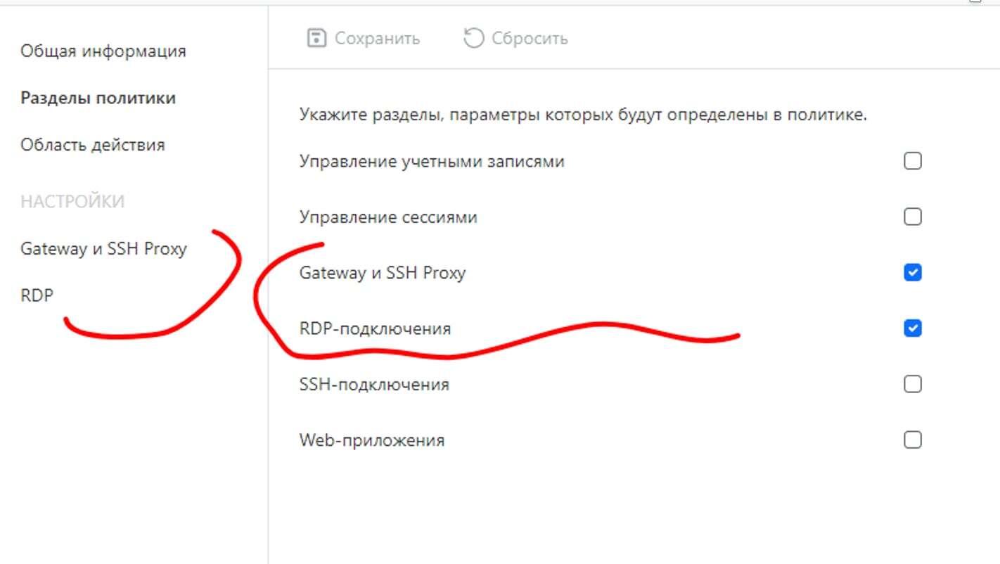 2 В политике перейти в Раздел политики и включить RDP подключения и Gateway и SSH Proxy. Нажать Сохранить.